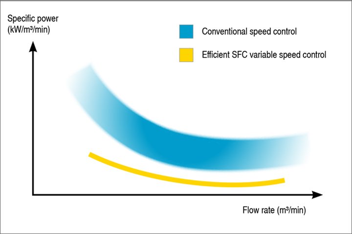 The flow rate can be adjusted within the control range according to pressure to suit actual compressed air demand. This keeps the operating pressure to within ±0.1 bar. This allows maximum pressure to be reduced which saves both energy and money.