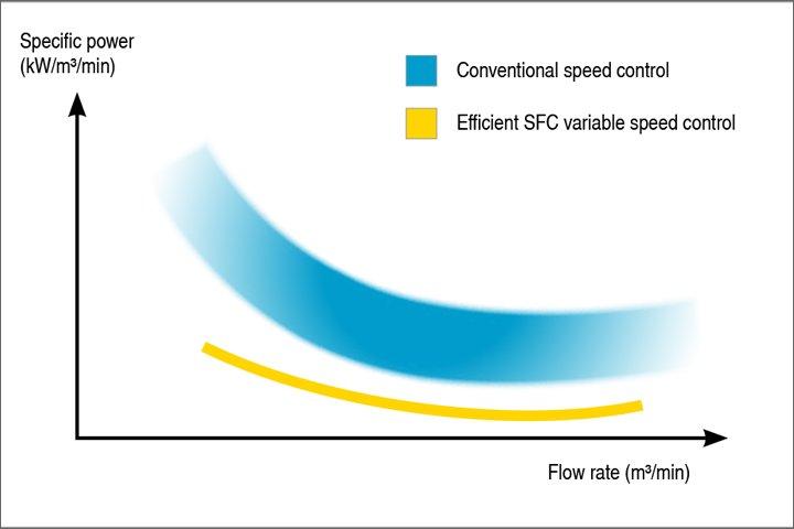 The flow rate can be adjusted within the control range according to pressure to suit actual compressed air demand. This keeps the operating pressure to within ±0.1 bar. This allows maximum pressure to be reduced which saves both energy and money.